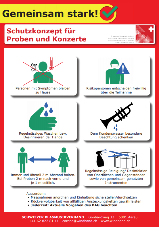 Organisation von SommerlagernAuf Grundlage der Beschlüsse des Bundesrates vom 27. Mai 2020, hat der Vorstand des kantonalen Musikverbandes in seiner Sitzung vom 3. Juni 2020 über organisatorische Möglichkeiten gesprochen, die die Durchführung von Sommerlagern zulassen. Weitere Auskünfte und Rahmenvorgaben finden Sie auf der Webseite des Bundesamtes für Sport und Kultur: Grundsätzlich sollten folgende Punkte weiter beachtet werden: